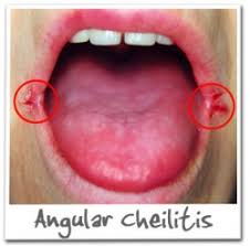 Cracks at the side of the mouth (angular cheilities) are sometimes due to anaema , which occurs when there is a shortage of iron in the body .